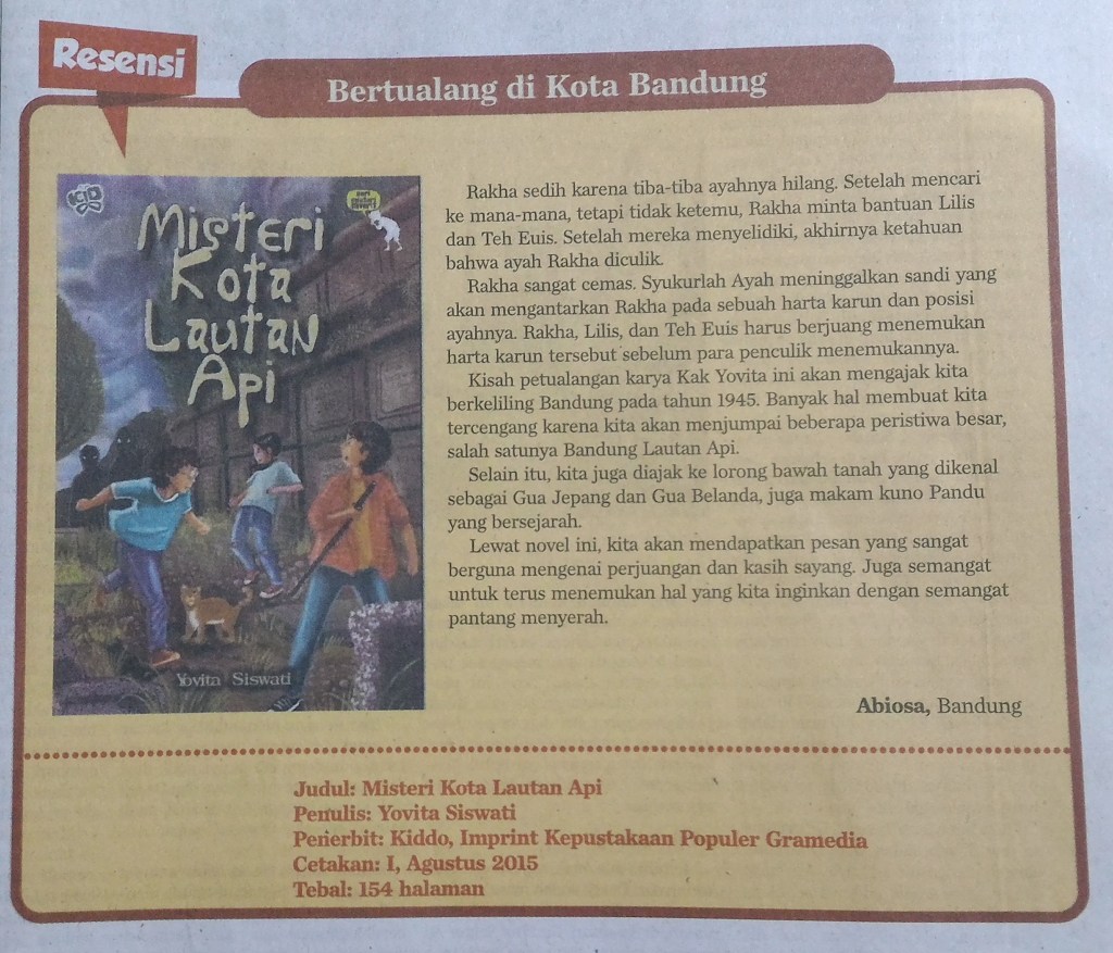 Demikian cuplikan dari resensi buku Misteri Kota Lautan Api di Kompas Anak bulan September 2015. Thanks Mas Abiosa yang sudah mengirimkan resensi ini ke Kompas. Thanks Penerbit Kiddo for your enormous support. Semoga buku ini bermanfaat untuk anak-anak.