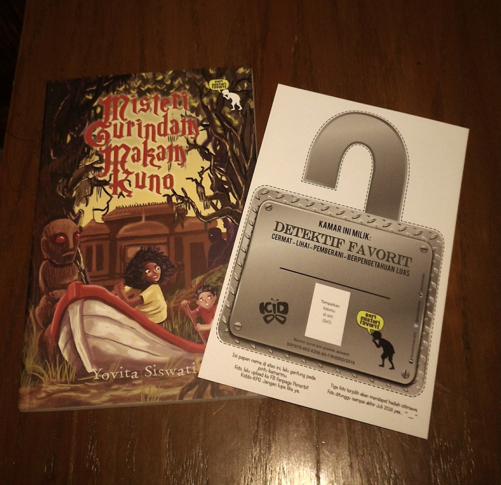 Okeh, sewaktu membuka bukti terbit buku Misteri Gurindam Makam Kuno, ada selipan yang terjatuh dari dalam buku. Dan…jreng! Ternyata, beneran, serius! Ada bonus gantungan pintu super keren! Penampakannya seperti di bawah ini :
