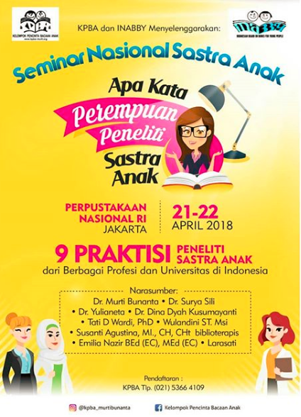 Pada tanggal 21 hingga 22 April lalu, saya berkesempatan untuk mengikuti Seminar Nasional : Apa Kata Perempuan Peneliti Sastra Anak yang diadakan di Perpustakaan Nasional Jakarta. Seminar ini diselenggarakan oleh Kelompok Pencinta Bacaan Anak (KPBA) pimpinan Ibu Murti Bunanta.