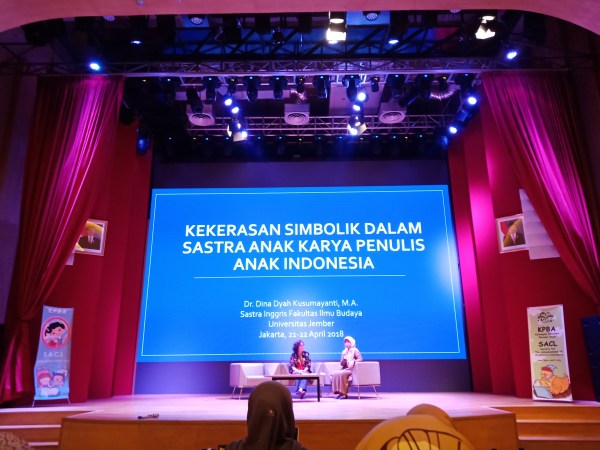 Topik yang menjadi favorit saya adalah “Buku Bacaan Anak Pilihan Dilihat dari Isi, Penyajian, Bahasa, Ilustrasi dan Penggunaan serta Kegunaan” yang dibawakan oleh Dr. Murti Bunanta dan “Kekerasan Simbolik Dalam Sastra Anak Karya Penulis Anak Indonesia” yang dipresentasikan oleh Dr. Dina Dyah Kusumayanti. Kedua topik ini, menurut saya juga interelated, sama-sama menyampaikan pesan bahwa penulis buku anak seharusnya menulis untuk seluruh kalangan Anak Indonesia dan tentang Indonesia.