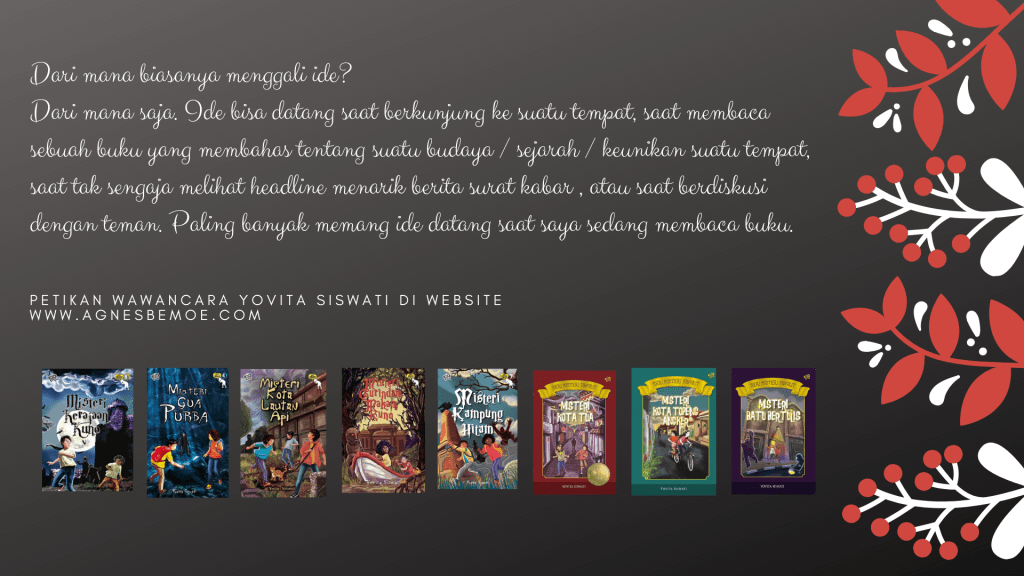 Beberapa waktu lalu, Kak Agnes Bemoe mengutarakan niat untuk mewawancarai saya, terutama terkait aktivitas saya dalam menulis novel-novel seri misteri favorit, dan menuliskannya di dalam blognya : www.agnesbemoe.com Tentu saja, saya setuju dan feel honored karena siapalah saya ini. Karena kebaikan hati Kak Agnes, artikel wawancara itu akhirnya terbit dengan judul : Most Inspiring Fellow Author [MIFA]: Yovita Siswati: Dari Tangerang untuk Anak Indonesia