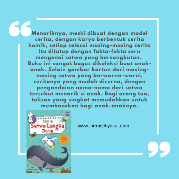 Di atas adalah cuplikan dari review buku Cerita Satwa Langka Dunia di website Herusetiyaka.com. Ulasan lengkap bisa dibaca di link ini : Membaca Cerita Anak : Cerita Satwa Langka Dunia