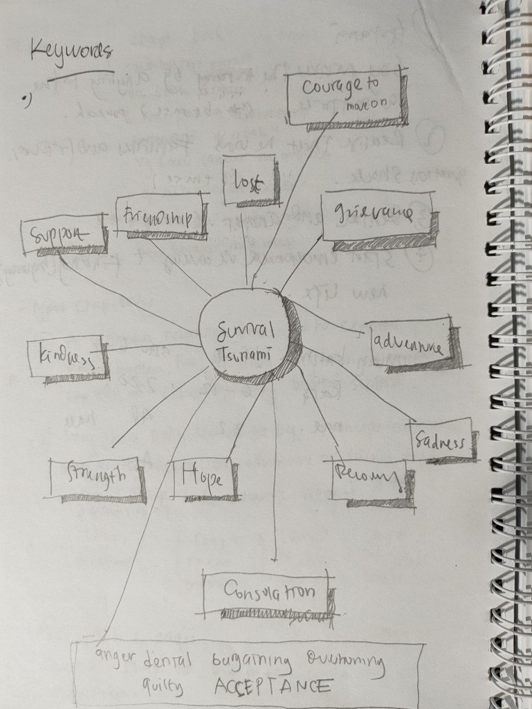 Setiap peserta workshop hanya akan menulis satu cerita saja. Dari dua cerita yang saya ikutkan dalam audisi, cerita yang akan dikembangkan adalah cerita dengan tema bencana. Saat membuat draft naskah audisi, saya terispirasi dari kisah anak-anak survivor tsunami Aceh. Saya membuat cerita mengenai tokoh utama, Itam semenjak bencana hingga ia pergi, dewasa dan kembali ke tempat di mana tsunami terjadi. Tetapi kemudian setelah menerima materi hari pertama dan berdiskusi dengan para editor : Mbak Monalisa dari Penerbit Bestari dan Ibu Eva Nukman juga dengan konsultan cerita Deborah L. Davis, maka focus cerita pun berpindah hanya pada masa-masa awal perjuangan Itam menghandapi kesedihan akibat kehilangan seluruh anggota keluarga dan sahabatnya akibat tsunami. Cerita bertitik berat pada bagaimana Itam, seorang anak berusia kira-kira 8 tahun menghadapi tahap-tahap kesedihan (stages of grief) mulai dari penyangkalan, kemarahan, tawar-menawar dengan keadaan hingga acceptance. Saya mendapat banyak bantuan dari Deborah untuk memahami tahap-tahap kesedihan ini.