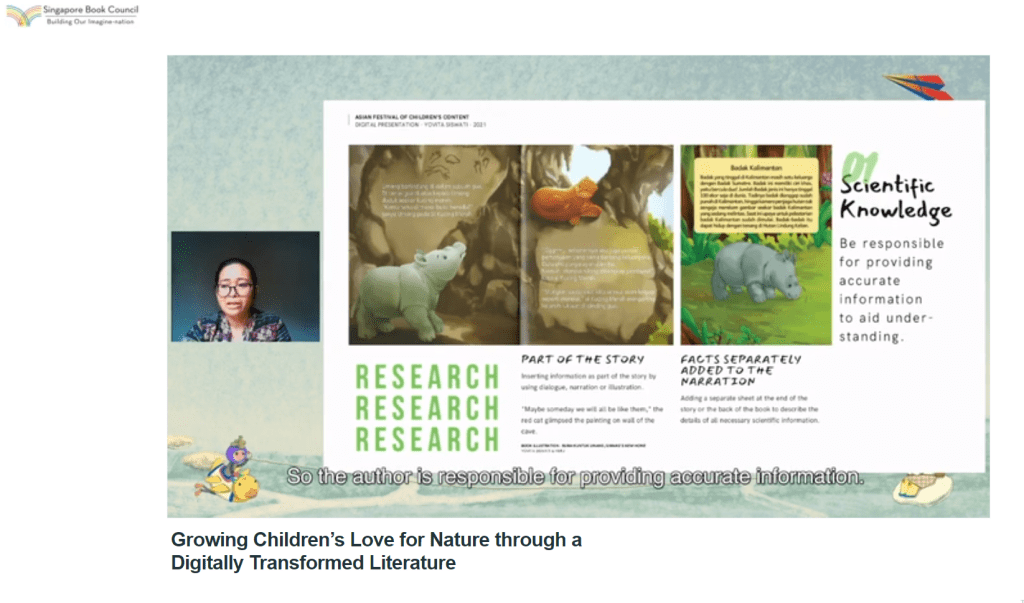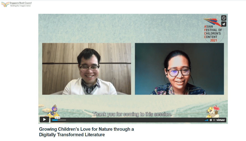 Asian Festival of Children’s Content (AFCC) adalah festival tahunan yang diadakan oleh Dewan Buku Singapura. Di festival ini berkumpul para penulis, ilustrator, content creator , guru, pustawakan, pendidik, orangtua, atau siapapun yang tertarik dengan sastra anak dan konten untuk anak-anak. Sejak tahun 2017 hingga 2019, saya selalu hadir di Singapura untuk festival ini sebagai peserta maupun pembicara. Di tahun 2020 festival terpaksa ditiadakan karena pandemi Covid 19. Pada 2021 lalu, acara kembali diadakan walupun secara hybrid, yaitu gabungan antara tatap muka dan online. Di tahun 2021, saya menjadi pembicara dengan tema makalah “Growing Children’s Love for Nature through a Digitally Transformed Literature”
