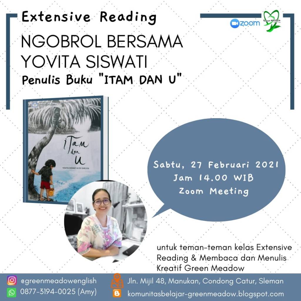 Aktivitas pertama saya dimulai di bulan Februari saat saya diminta untuk berbagai kisah penciptaan buku Itam dan U bersama Komunitas Green Meadow, sebuah kelompok belajar alternatif yang berpusat di kota Jogyakarta. Cerita saya tentang kegiatan ini bisa dilihat di sini : Ngobrol Bersama Komunitas Green Meadow : Itam dan U