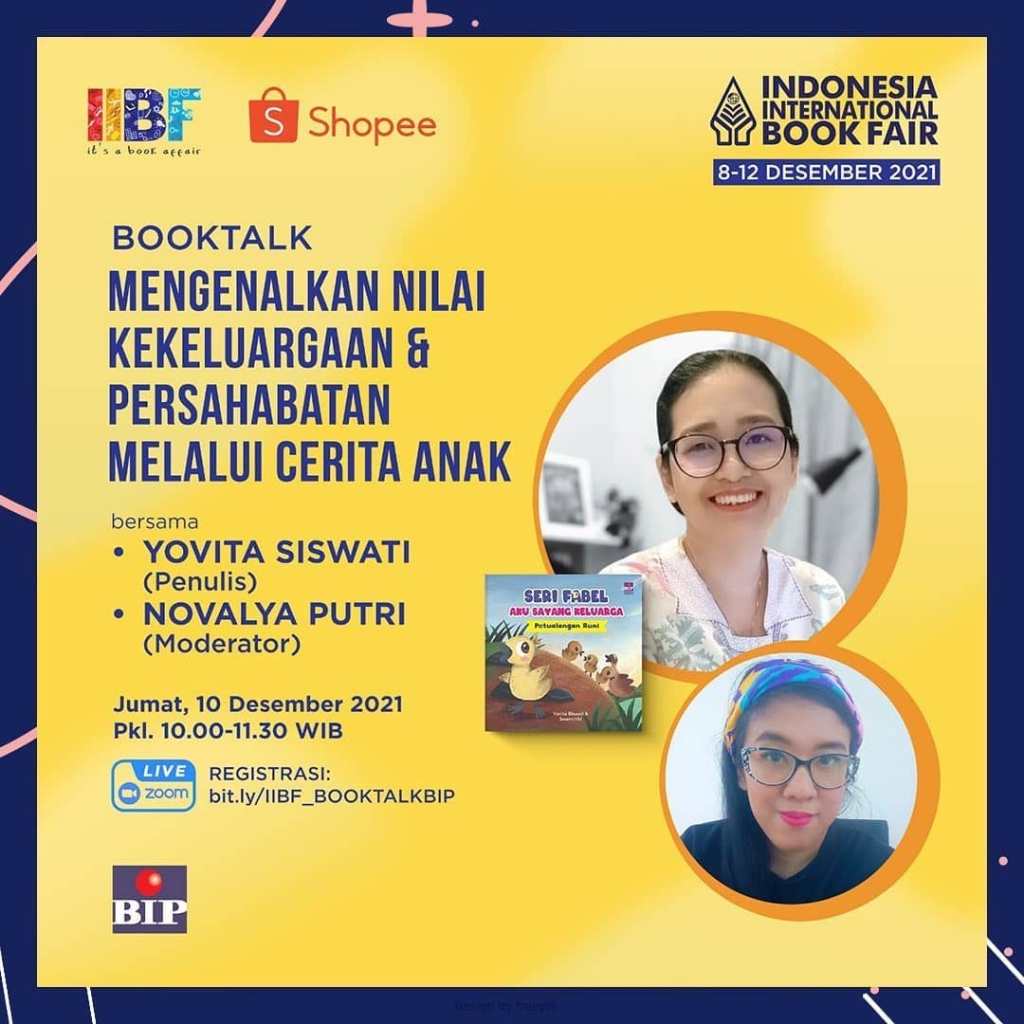 Menutup tahun 2021, saya mendapat kehormatan dari penerbit BIP untuk mengisi acara di Indonesia International Book Festival (IIBF) tahun 2021 di bulan Desember. Cerita lengkap mengenai apa yang saya bagikan dalam booktalk ini bisa dibaca di sini : Seri Fabel Aku Sayang Keluarga di IIBF 2021