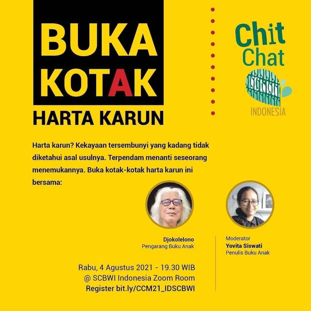 Bulan Agustus mendadak jenaka, karena saya mendadak mendapat kesempatan untuk menjadi moderator dalam acara bincang santai yang diadakan oleh Komunitas Society of Children’s Book Writer and Illustrator (SCBWI) chapter Indonesia. SCBWI biasanya mengadakan acara rutin ini di hari Rabu malam setiap dua minggu sekali. Saya senang sekali karena bisa menimba ilmu dari Eyang Djoko secara langsung melalui sesi talkshow yang sangat meriah. Cerita lengkapnya ada di artikel ini : Oleh-Oleh Dari Acara Chit Chat Bersama Djokolelono