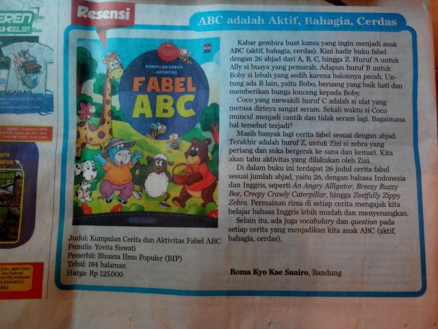 “Di dalam buku ini terdapat 26 judul cerita fabel sesuai abjad, dengan bahasa Indonesia dan Inggris….Selain itu ada juga vocabulary dan question pada setiap cerita yang menjadikan kita anak ABC (Aktif Bahagia Cerdas.” (Roma Kyo […]